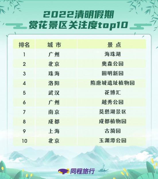春季也是人们赏花踏青的好季节,相比室内游览项目,户外游览空间开阔,也能避免人流密集。报告称,今年清明小长假各大城市及郊区的公园、植物园将迎来赏花生态游的人潮。北京门头沟区、密云区文旅局先后推出了多条清明踏青游主题线路,海口文旅局也针对清明小长假市场推出了20多条主题线路,方便游客清明出游。数据显示,广州的海珠湖,北京的奥森公园,珠海的圆明新园是国内关注度最高的赏花游景区。