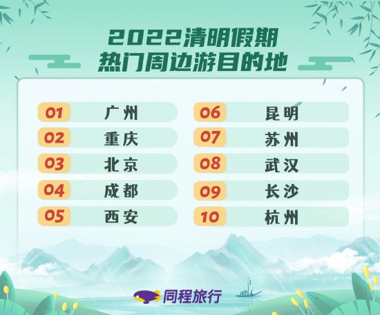 报告称,受到疫情影响,清明小长假有出游计划的人群更多选择了本地游或1-2天的微旅游。同程旅行大数据显示,今年清明小长假期间的酒店订单中,本地酒店订单占比超过60%,其中,大城市周边的精品酒店和民宿关注度较高。此外自驾、露营等私密性更好的旅行方式受到游客欢迎。数据显示,清明小长假期间本地周边游热门城市TOP10分别为:广州、重庆、北京、成都、西安、昆明、苏州、武汉、长沙、杭州。
