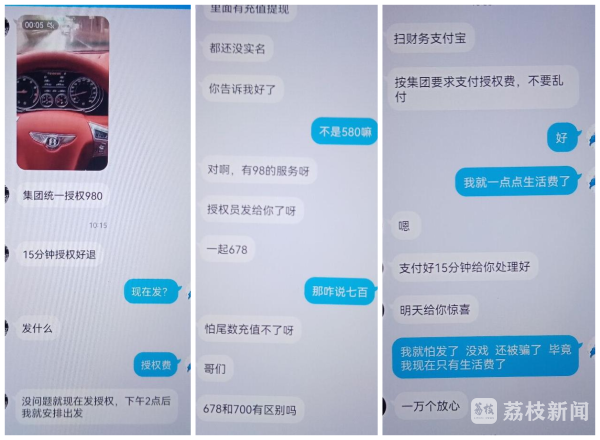 起初,小张并不相信,对方表示可以自证身份,并向其发送了各种驾驶豪车的视频,随后更有一张余额为9亿元的支付宝截图为证。面对大量的“证据”,小张逐渐激动起来,也完全相信对方。很快,对方告诉小张,开店的6万资金已经准备好,马上就可以把钱转到其账户,但由于这是集团的“资助基金”,需要支付980元授权费才行。小张没有怀疑,直接将钱汇了过去。