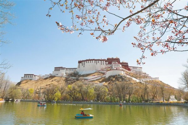经过春意润染的城市,处处呈现出纯净明朗的美。布达拉宫的金顶反射着耀眼的金光,布达拉宫广场前绿草茵茵,人工湖旁的垂柳被和煦的春风吹得飘飘扬扬,罗布林卡里的古树也开始抽出鲜嫩的枝叶,繁华的八廓街上,三五成群的转经老人坐在路边歇息……