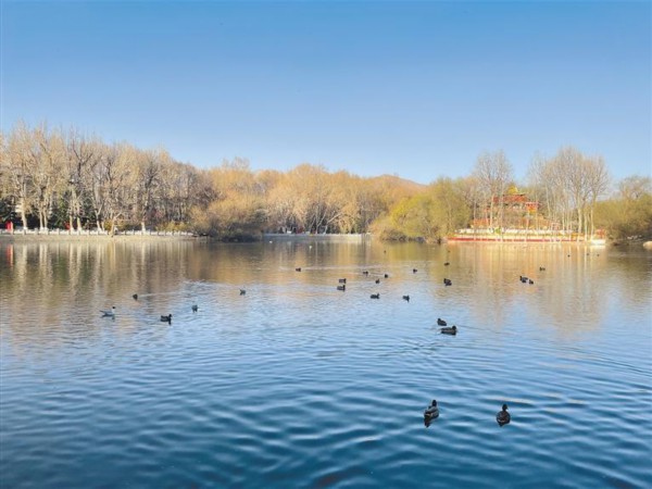 图⑤:在宗角禄康公园湖面上戏水的野鸭。