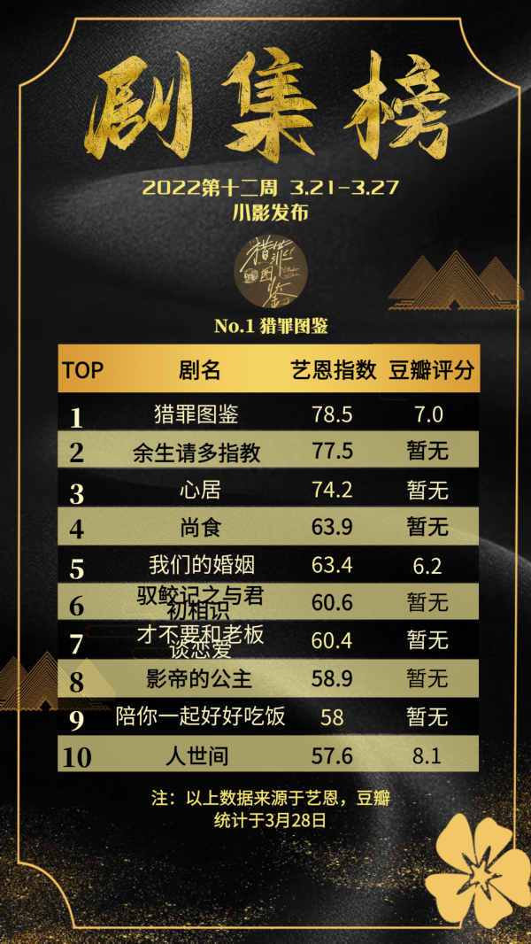 《婚姻的两种猜想》《我们的婚姻》《相逢时节》完结后,婚姻题材热度下降,悬疑剧势头衰退,《猎罪图鉴》收官后,当前仅有一部《黑金风暴》在播,选择较少。而春暖花开季,都市偶像题材进一步升温,爱情正在蔓延。