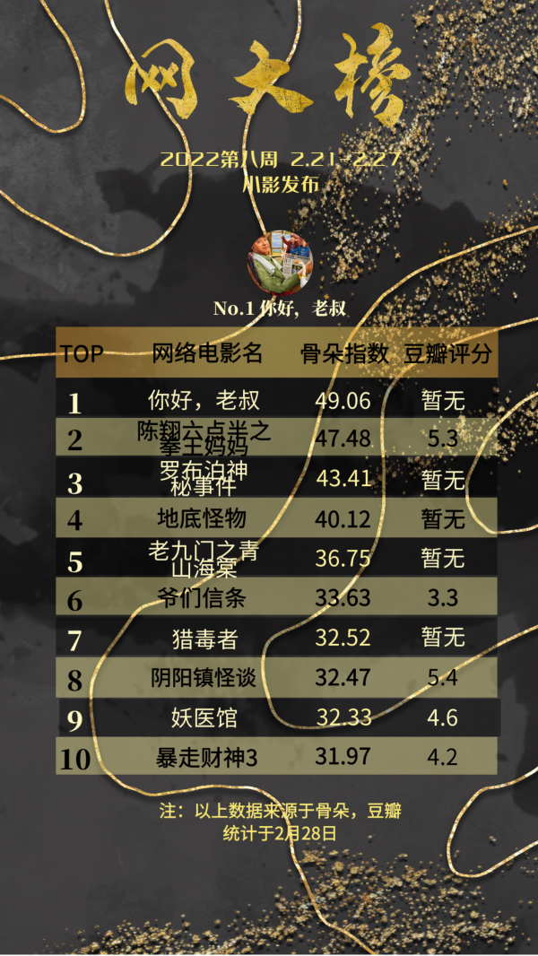 三月院线方面,有文松自导自演的《卧鼠藏虫》,而这周的网大榜首,是“赵四”刘小光自导自演的《你好,老叔》。