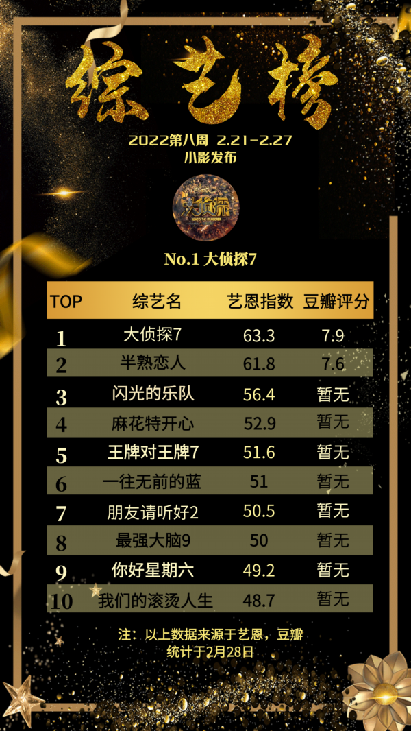 本周,《大侦探7》热度攀升至榜首,轻熟龄恋爱观察综《半熟恋人》收官,热度回落,全景沉浸式消防体验真人秀《一往无前的蓝》新面孔闯入榜单。