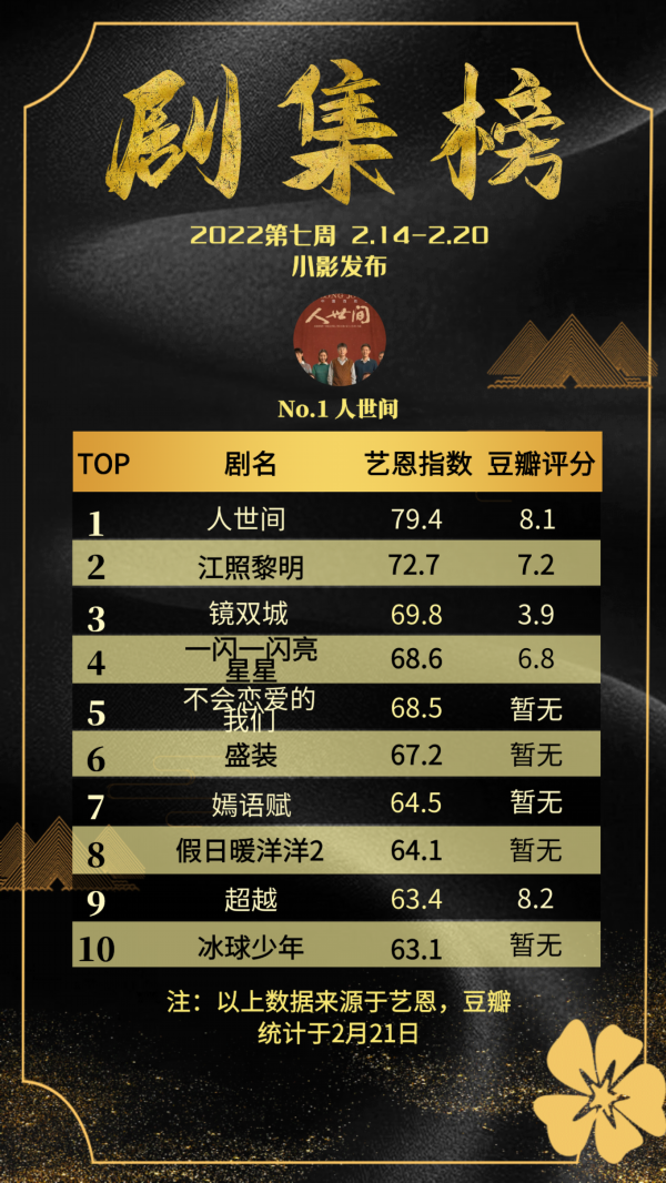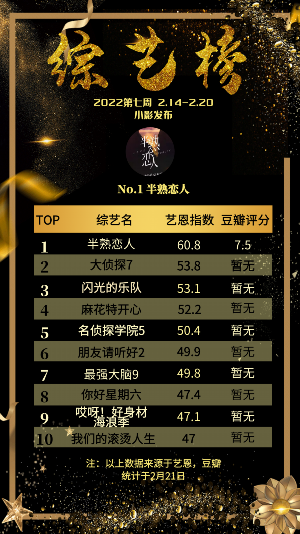 本周,观察类综艺《半数恋人》登顶,聚焦30+轻熟人群,拓宽爱情内容新的赛道。《大侦探7》紧随其后,这几年“剧本杀”类的综艺节目颇受欢迎,但在同类的推理节目中,《大侦探》始终有着不可撼动的观众缘,在“综n代”节目多显疲态的时候,《大侦探》一直维持着豆瓣高分。