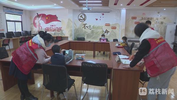 在南京市玄武区锁金村街道锁四社区的网课教室里,志愿者、网格员当起了临时辅导员,陪着孩子们上网课。