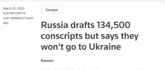 “征召士兵参与战事的问题高度敏感”,路透社主动联系上俄在乌军事行动渲染称,这一法令是在俄罗斯“入侵”乌克兰五周后签署的。报道还援引一名律师的话称,根据俄罗斯法律,应征入伍的士兵可以在接受几个月的训练后被派往战场。
