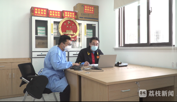 由于下沉一线抗疫,杜法官手头的不少案件都适当改期了。但这起公告案件如果改期,将给当事人带来极大的不便。当天一早,管控区旁的党群服务中心办公室就被布置成了临时法庭:一枚国徽,一个法槌,一台电脑,杜法官准时上线开庭。南京市栖霞区人民法院立案庭诉讼服务中心副主任杜宏亮介绍,“公告庭审如果开不了的话,首先第一需要原告方再次缴纳公告的费用,且要重新登报公告,公告之后至少要等一个月的时间,一个月以后才可以排上庭,这样对原告带来了很大的诉累。我昨天也跟我们临时管控的社区报备过,社区领导也大力支持,在这个社区专门腾出来一个办公室来”。