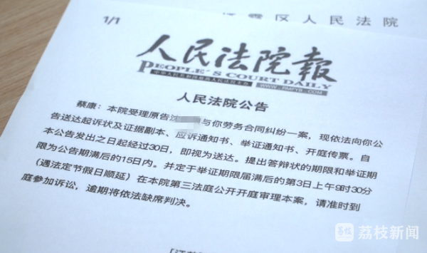 “我们请求法院支持我们的诉讼请求,让被告赶紧把我们的工资发了”。3月30日上午9点半,这起案件准时开庭审理。南京市栖霞区人民法院立案庭诉讼服务中心副主任杜宏亮介绍,“这是一起原告起诉被告方偿还劳务费的案件,原告是外来务工人员,被告一直找不到,下落不明,之前已经通过登报的方式确定了开庭时间。这样的公告庭不好改期”。
