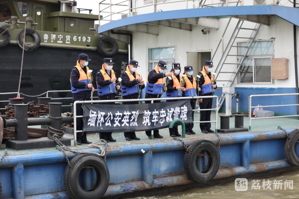 清明节前夕,长江航运公安局镇江分局联合镇江出入境边防检查站民警在公安趸船码头边向江中敬撒鲜花,祭奠公安英烈。