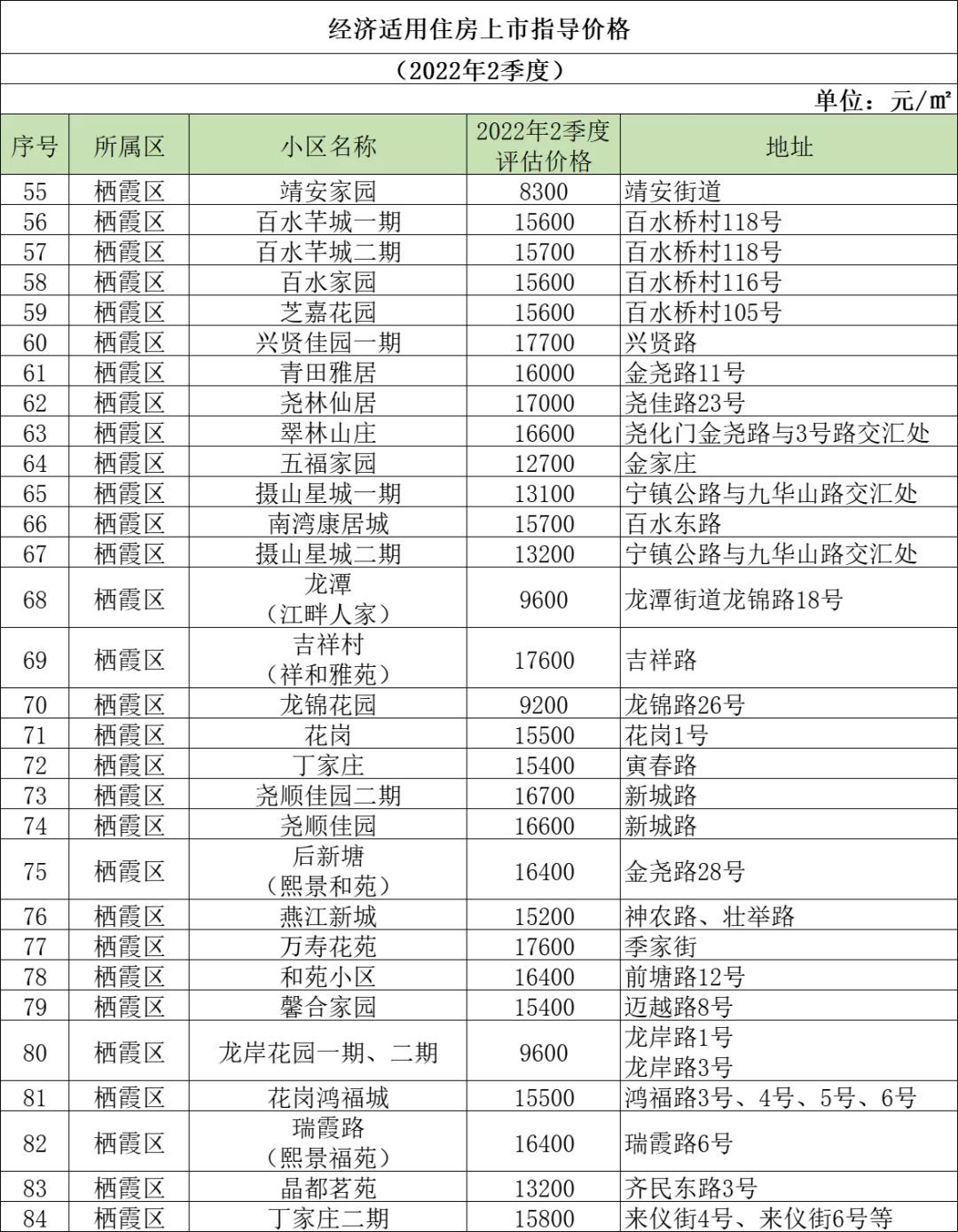 记者发现,多数经适房小区的指导价上涨了300元至500元/㎡,也有个别涨幅较大的,如雨花台区的双龙嘉园,比一季度上涨700元/㎡,建邺区的精金花园则比一季度上涨1000元/㎡。涨幅最高的是位于鼓楼区的佳和园,比一季度的26700元/㎡上涨1500元/㎡,同时,该小区28200元/㎡的指导价也是85个经适房小区中最高的一个。此外,也有4个小区的指导价与今年一季度持平,分别是位于栖霞区的靖安家园、龙锦花园、龙潭(江畔人家)以及龙岸花园一期、二期,指导价在8300元/㎡至9600元/㎡之间。