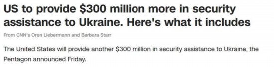 美国有线电视新闻网(CNN)刚刚消息,五角大楼当地时间4月1日宣布,美国将再向乌克兰提供价值3亿美元的安全援助。