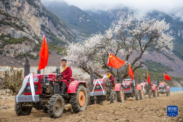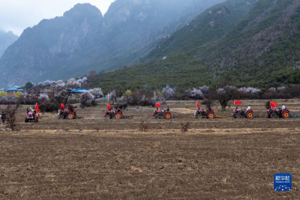 峡谷长,青柏翠。一丛丛桃红,一块块方田。有“藏北秘境”美誉的西藏那曲市嘉黎县尼屋乡,在芳草鲜美的画景中,迎来春耕。