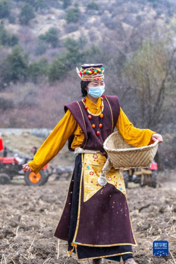 只见仁增旺姆手里端着装满青稞的竹筐,向田间撒下希望的种子。春耕队伍跟随在她的身后,肥沃的土地被犁出一道道深深的垄沟。