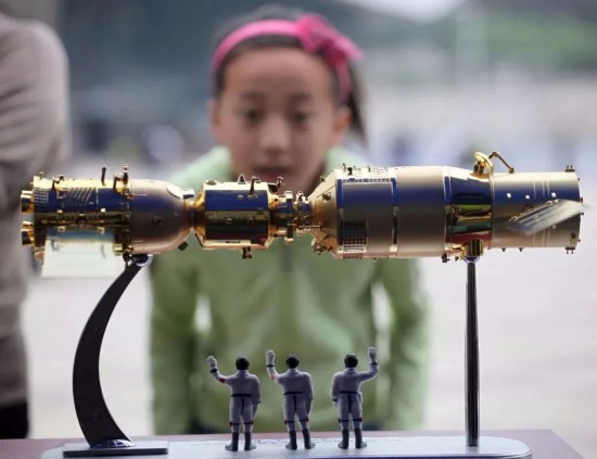 2014年5月17日,一名小朋友在南京科技馆广场参观天宫一号、神舟九号载人交会对接模型。(来源:新华社)