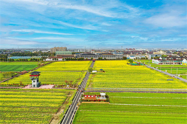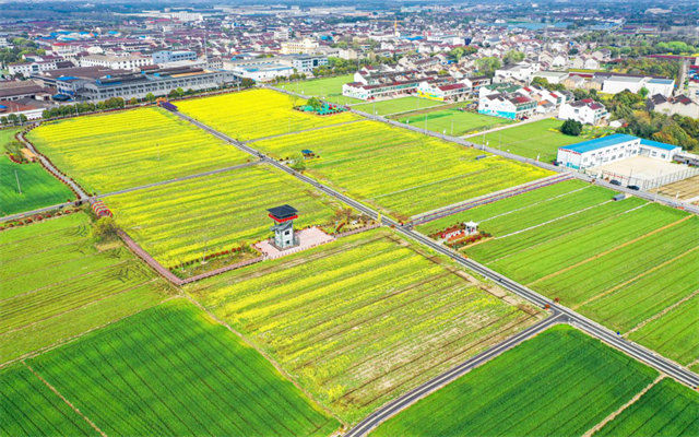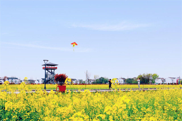 在武进区前黄镇联庆村,百亩金黄色的花田次第铺开。一簇簇油菜花在微风吹拂下,轻轻摇曳,与蓝天白云、村落人家相映成趣。
