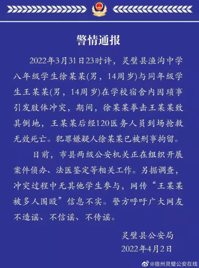 荔枝新闻讯 据@宿州灵璧公安在线 ,2022年3月31日23时许,灵璧县渔沟中学八年级学生徐某某(男,14周岁)与同年级学生王某某(男,14周岁)在学校宿舍内因琐事引发肢体冲突,期间,徐某某拳击王某某致其倒地,王某某后经120医务人员到场抢救无效死亡。犯罪嫌疑人徐某某已被刑事拘留。