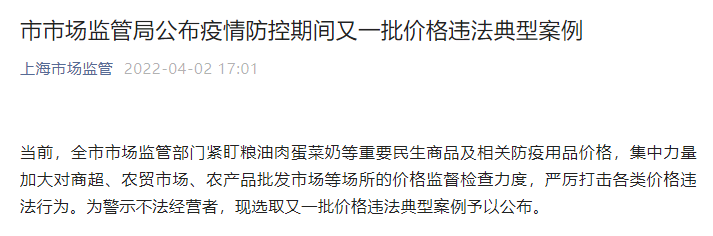 荔枝新闻讯 “上海市场监管”微信公众号4月2日消息,当前,上海市场监管部门紧盯粮油肉蛋菜奶等重要民生商品及相关防疫用品价格,集中力量加大对商超、农贸市场、农产品批发市场等场所的价格监督检查力度,严厉打击各类价格违法行为。为警示不法经营者,现选取又一批价格违法典型案例予以公布。
