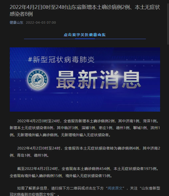 2022年4月2日0时至24时,全省报告本土无症状感染者转为确诊病例4例,其中济南2例、青岛1例、德州1例。