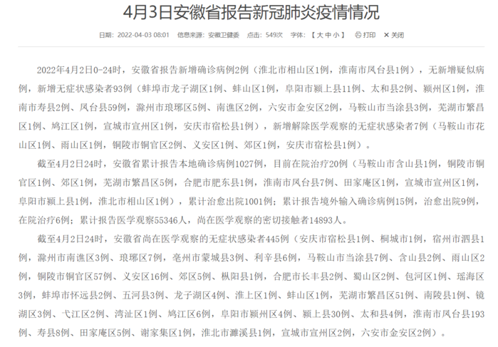 荔枝新闻讯 据安徽卫健委网站消息,2022年4月2日0-24时,安徽省报告新增确诊病例2例(淮北市相山区1例,淮南市凤台县1例),无新增疑似病例,新增无症状感染者93例(蚌埠市龙子湖区1例、蚌山区1例,阜阳市颍上县11例、太和县2例、颍州区1例,淮南市寿县2例、凤台县59例,滁州市琅琊区5例、南谯区2例,六安市金安区2例,马鞍山市当涂县3例,芜湖市繁昌区1例、鸠江区1例,宣城市宣州区1例,安庆市宿松县1例),新增解除医学观察的无症状感染者7例(马鞍山市花山区1例、雨山区1例,铜陵市铜官区2例、义安区1例、郊区1例,安庆市宿松县1例)。