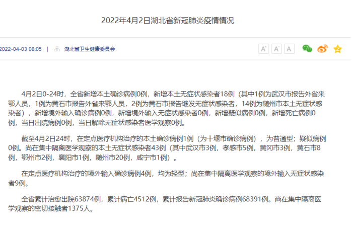 荔枝新闻讯 据湖北省卫健委网站消息,4月2日0-24时,全省新增本土确诊病例0例,新增本土无症状感染者18例(其中1例为武汉市报告外省来鄂人员,1例为黄石市报告外省来鄂人员,2例为黄石市报告继发无症状感染者,14例为随州市本土无症状感染者),新增境外输入确诊病例0例,新增境外输入无症状感染者0例,新增疑似病例0例,新增死亡病例0例,当日出院病例0例,当日解除无症状感染者医学观察0例。