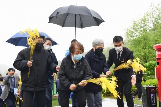 鞠躬行礼,将稻穗敬献在墓前