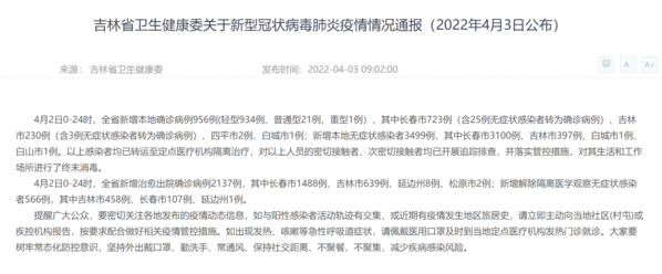 4月2日0—24时,吉林全省新增治愈出院确诊病例2137例,其中长春市1488例、吉林市639例、延边州8例、松原市2例;新增解除隔离医学观察无症状感染者566例,其中吉林市458例、长春市107例、延边州1例。