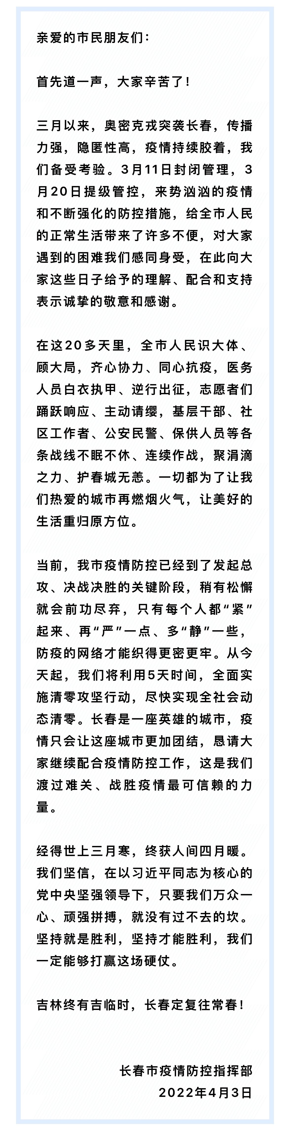 荔枝新闻讯 据“掌上长春”微信公号消息,吉林长春市疫情防控指挥部3日发布《致广大市民朋友的一封信》,内容如下。
