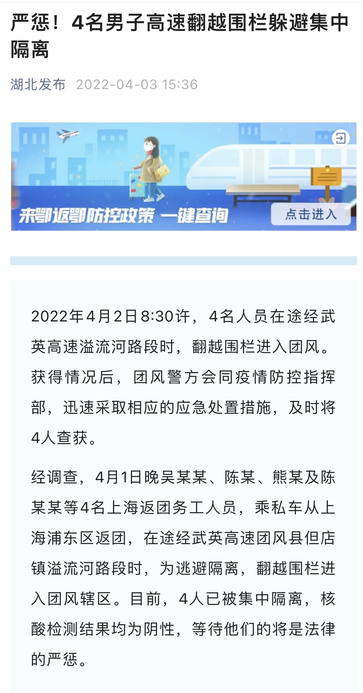 经调查,4月1日晚吴某某、陈某、熊某及陈某某等4名上海返团务工人员,乘私车从上海浦东区返团,在途经武英高速团风县但店镇溢流河路段时,为逃避隔离,翻越围栏进入团风辖区。目前,4人已被集中隔离,核酸检测结果均为阴性,等待他们的将是法律的严惩。