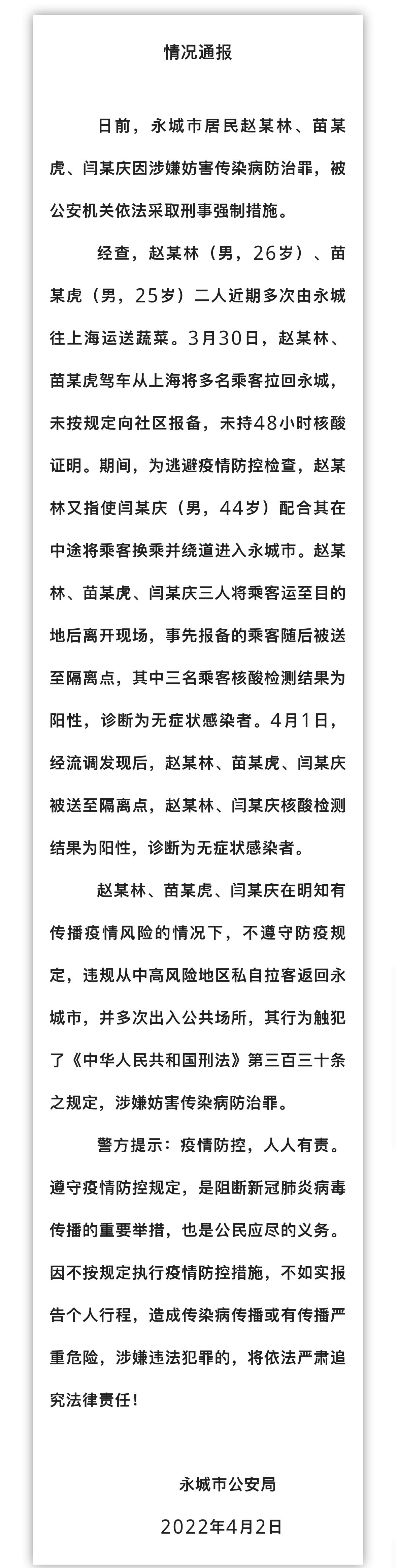经查,赵某林(男,26岁)、苗某虎(男,25岁)二人近期多次由永城往上海运送蔬菜。3月30日,赵某林、苗某虎驾车从上海将多名乘客拉回永城,未按规定向社区报备,未持48小时核酸证明。期间,为逃避疫情防控检查,赵某林又指使闫某庆(男,44岁)配合其在中途将乘客换乘并绕道进入永城市。赵某林、苗某虎、闫某庆三人将乘客运至目的地后离开现场,事先报备的乘客随后被送至隔离点,其中三名乘客核酸检测结果为阳性,诊断为无症状感染者。4月1日,经流调发现后,赵某林、苗某虎、闫某庆被送至隔离点,赵某林、闫某庆核酸检测结果为阳性,诊断为无症状感染者。