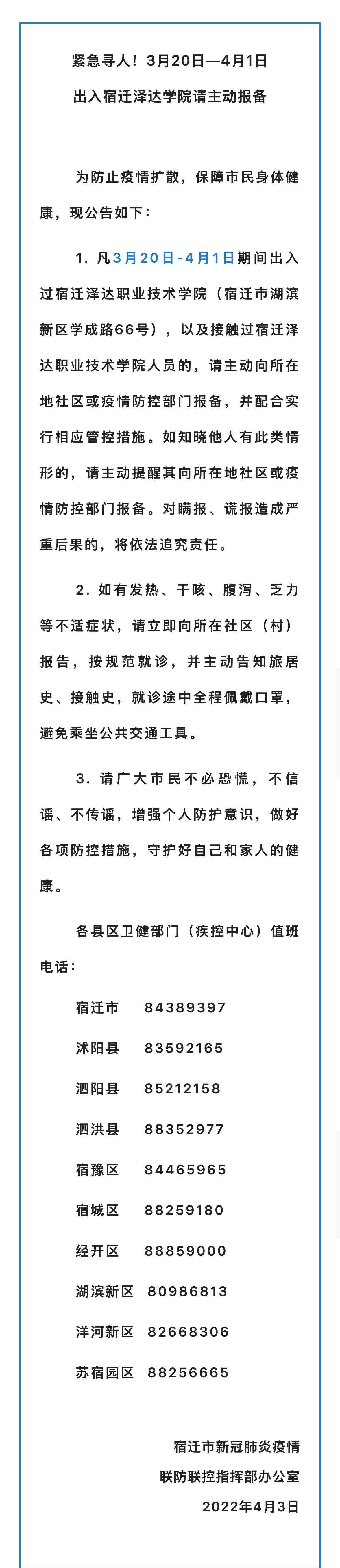 1. 凡3月20日-4月1日期间出入过宿迁泽达职业技术学院(宿迁市湖滨新区学成路66号),以及接触过宿迁泽达职业技术学院人员的,请主动向所在地社区或疫情防控部门报备,并配合实行相应管控措施。如知晓他人有此类情形的,请主动提醒其向所在地社区或疫情防控部门报备。对瞒报、谎报造成严重后果的,将依法追究责任。