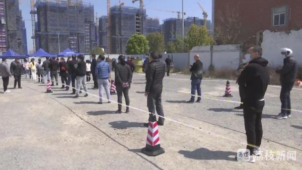 上午十点,记者在南通出租车总公司看到,的哥的姐间隔一米,戴好口罩,依次进行核酸检测。