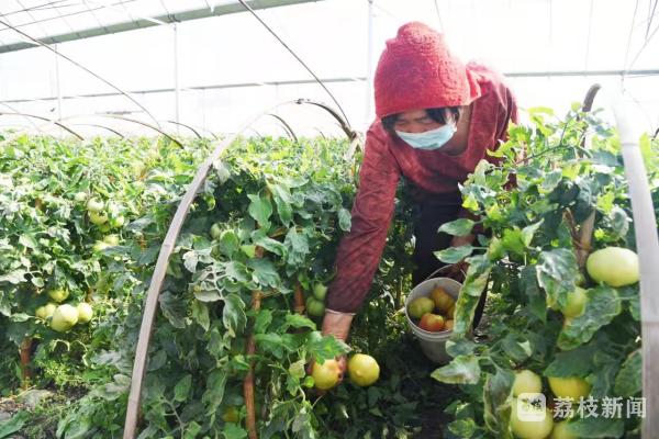 成熟的番茄挂满枝头,丰收的喜悦写在脸上……兴化市陈堡镇蒋庄村田头的一座大棚里,农户严网居正在将熟了的番茄采摘下来,细心地装好待售。