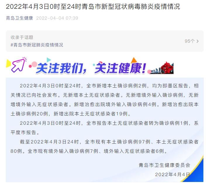 荔枝新闻讯 据青岛卫生健康微信公众号消息,2022年4月3日0时至24时,青岛市新增本土确诊病例2例,均为即墨区报告,相关情况已向社会发布。无新增本土无症状感染者。无新增境外输入确诊病例,无新增境外输入无症状感染者。新增治愈出院境外输入确诊病例4例。新增治愈出院本土确诊病例20例,新增出院本土无症状感染者19例。