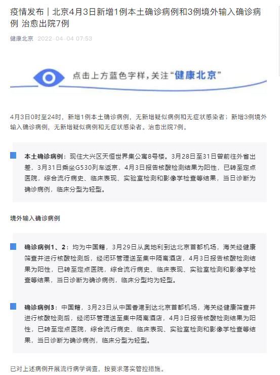 荔枝新闻讯 据健康北京微信公众号消息,4月3日0时至24时,北京新增1例本土确诊病例,无新增疑似病例和无症状感染者;新增3例境外输入确诊病例,无新增疑似病例和无症状感染者。治愈出院7例。