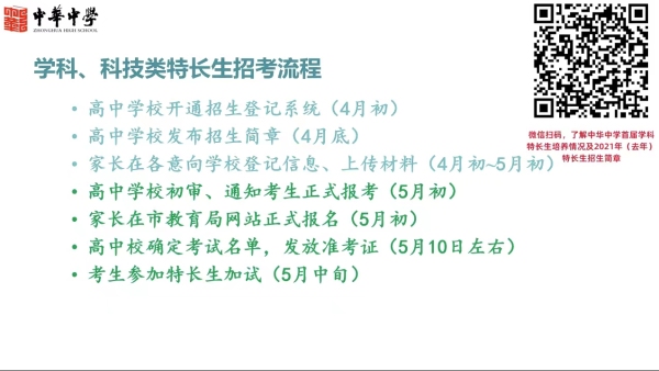 以往各个高中校都会在4、5月份举行“校园开放日”,一来展示各自的办学特色,二来接受考生家长的咨询。受疫情影响,目前除高三、初三年级外,南京其他年级依旧线上教学,很多高中学校开启云平台接受考生、家长的咨询。南京市中华中学在学校微信、视频号开通“兴雨星约”栏目,不仅有资深招生专家为考生答疑解惑,还有中华中学“学霸顾问团”和“名师亲友团”分享经验和指导。第一期由中华中学招生办公室主任姜国锋带来《特长生是什么?怎么报考?》。“南京市招生类型主要包括特长生、指标生、统招生。各类特长生正式报考只能选择一所学校的一个科目,全市同一时间加试。学科、特长生考试通过,可以放弃签约,但是一经签约,不可反悔。如果没有通过,不影响正常的中考和志愿填报。”姜国锋说。