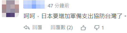 还有网友嘲讽,“呵呵,日本要增加军备支出协防台湾了”“军事扩张就是这样子开始的!”↓