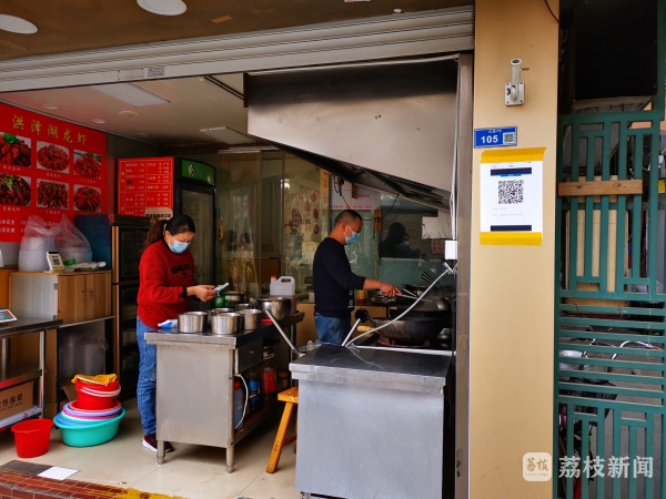 除了商业街区,一些街边的商铺人流量也不少。一家龙虾店店主李先生说,此前,进店顾客需要登记姓名、手机号码、并且要出具48小时内核酸检测报告、行程卡和健康码,非常繁琐。现在顾客只需扫描“场所码”,测温后就可以直接进入,非常方便。