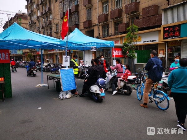 4月5日上午,记者来到新街口街道红庙商业街区,街区大门口设置了查验卡口,志愿者 “把守”在门口,指引进出人员,扫描现场设置的“场所码”。