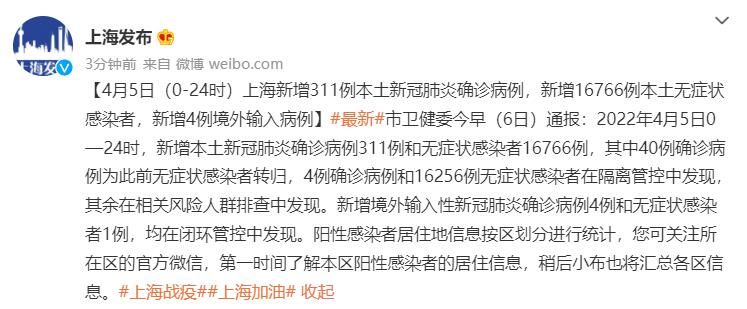 荔枝新闻讯 据上海发布微博消息,2022年4月5日0—24时,新增本土新冠肺炎确诊病例311例和无症状感染者16766例,其中40例确诊病例为此前无症状感染者转归,4例确诊病例和16256例无症状感染者在隔离管控中发现,其余在相关风险人群排查中发现。新增境外输入新冠肺炎确诊病例4例和无症状感染者1例,均在闭环管控中发现。
