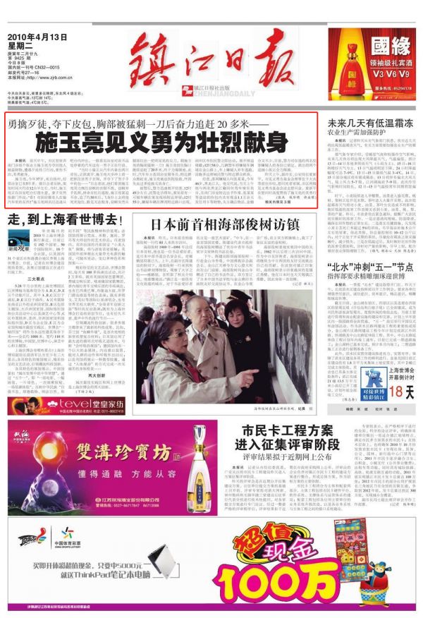 施玉亮,老家扬州市邗江区瓜州镇。2010年,那年的他37岁,4月11日中午12点半左右,正在浴室吧台打理生意的他,发现浴室对面不远处1名男子盗窃了汽车内的两只包正欲离开,他立即冲上前一把抓住该男子衣领,并夺下了男子手中的包。此时,该男子拼命反抗后逃脱,施玉亮紧追不舍,追了约30米后,再次抓住该嫌疑人。眼见无法脱身,穷凶极恶的男子掏出随身携带的刀具朝施玉亮的胸部刺去,施玉亮在追赶了20多米后,终因伤势较重倒地,嫌疑人趁机逃跑。倒在血泊中的施玉亮指着夺回的包对赶过来的浴室服务员说:“包夺回来了!”就再也没能开口讲话。施玉亮随后被送往医院抢救,因失血性休克,经抢救无效,英勇献身。