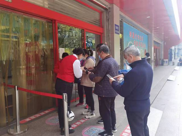 记者随机选择了几个大型超市,发现入口的检查很严格。在大润发关河门口,几位老人排队等待,准备进入超市购物。两名工作人员不但提醒他们戴好口罩,还耐心指导他们扫描场所码。“各位爷爷奶奶不要挤在一起,按照地面的一米线排队。”一名年轻工作人员不断提醒大家。