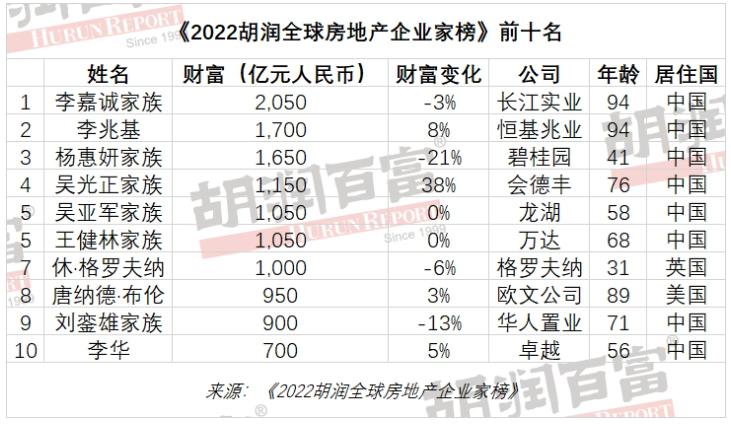4月6日,胡润研究院发布《2022胡润全球房地产企业家榜》。榜单显示,前十名上榜门槛为700亿元,8位来自中国,其中香港首富长江实业94岁的李嘉诚以2050亿元的财富成为全球房地产首富;恒基兆业94岁的李兆基以1700亿元排名第二;碧桂园41岁的杨惠妍以1650亿元排名第三。