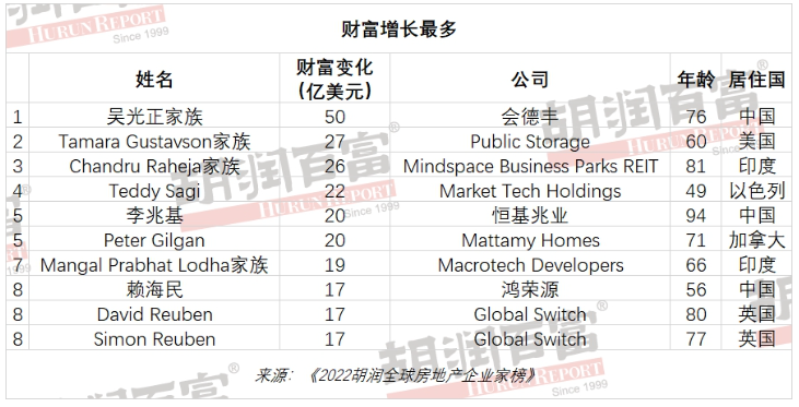 57位房地产企业家财富比去年增长,其中增长最多的是来自中国的会德丰76岁吴光正,增长了300亿元;其次是美国Public Storage 60岁的Tamara Gustavson,增长了200亿元。