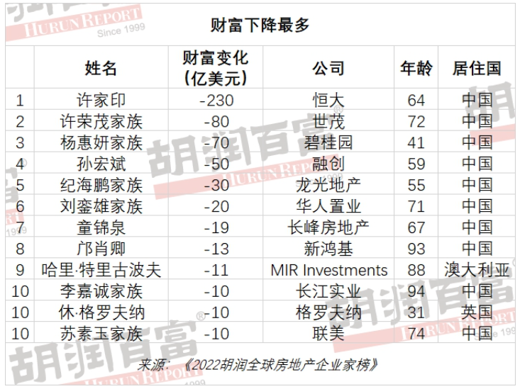 36位房地产企业家财富比去年下降,其中中国占三分之二(24位),财富下降最多的是恒大64岁的许家印,减少了1500亿元。