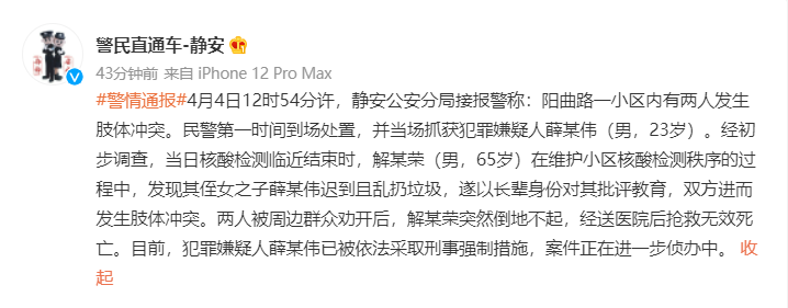 荔枝新闻讯 上海市公安局静安分局官方微博“警民直通车-静安”4月6日消息,4月4日12时54分许,静安公安分局接报警称:阳曲路一小区内有两人发生肢体冲突。民警第一时间到场处置,并当场抓获犯罪嫌疑人薛某伟(男,23岁)。经初步调查,当日核酸检测临近结束时,解某荣(男,65岁)在维护小区核酸检测秩序的过程中,发现其侄女之子薛某伟迟到且乱扔垃圾,遂以长辈身份对其批评教育,双方进而发生肢体冲突。两人被周边群众劝开后,解某荣突然倒地不起,经送医院后抢救无效死亡。