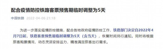 为进一步落实疫情防控措施,配合各地政府疫情防控工作,铁路部门决定自2022年4月7日起,铁路客票预售期临时调整为5天(含当天),恢复时间另行通知。同时将根据旅客购票情况,动态灵活安排运力,精准满足旅客出行需求。