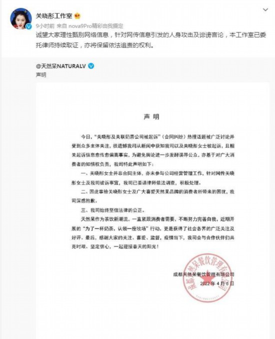 针对被起诉一事,成都天然呆餐饮管理有限公司官方微博“天然呆NATURALV”6日深夜发布声明回应称:关晓彤并非合同主体,亦未参与公司经营管理工作。针对网传关晓彤及公司被诉事宜,已委请律师依法调查,积极处理。
