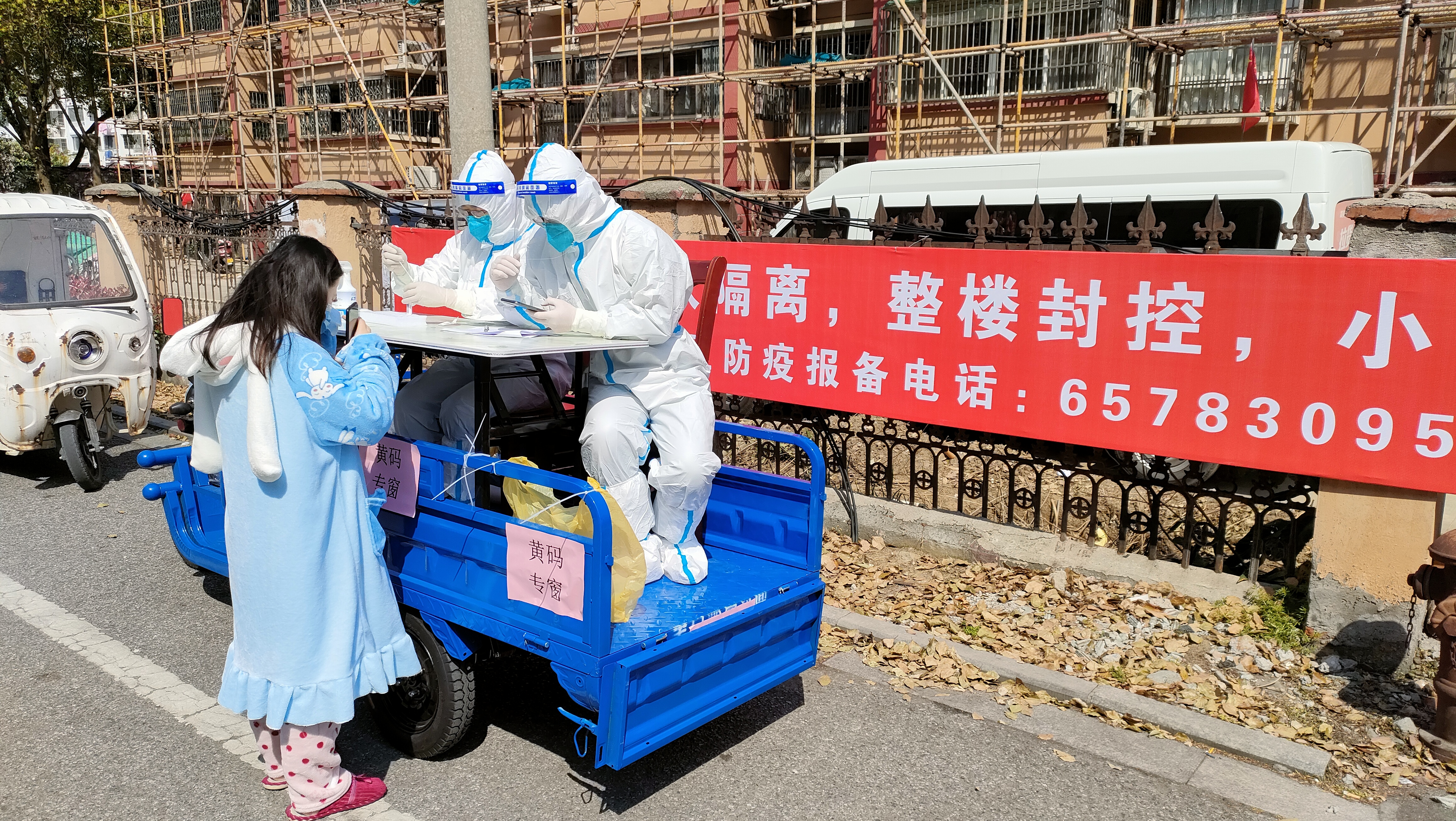 为扎实做好疫情防控工作,基层社区还开拓创新、汲取众智。为减少人员聚集,蠡口社区把四轮电动车临时改为流动核酸检测站,点对点对未做核酸的在管人员进行采样。