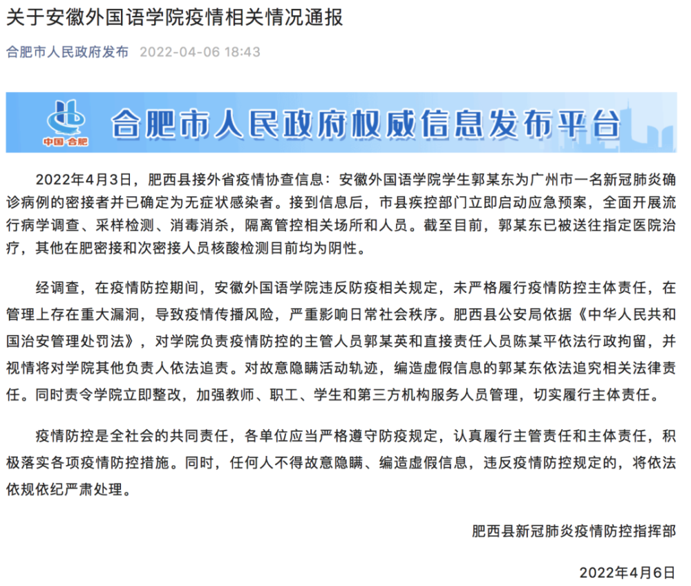 此前,肥西县新冠肺炎疫情防控指挥部发布《关于安徽外国语学院疫情相关情况通报》。